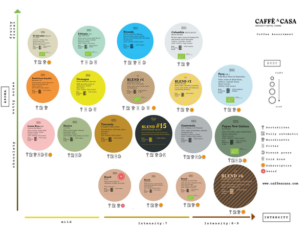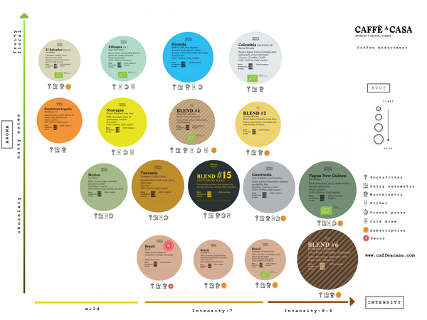 Welche Geschmacksrichtung suchen Sie? Schokoladig oder fruchtig? Mild oder intensiv? Für weitere Informationen klicken Sie bitte auf "ZUR KAFFEEKARTE".